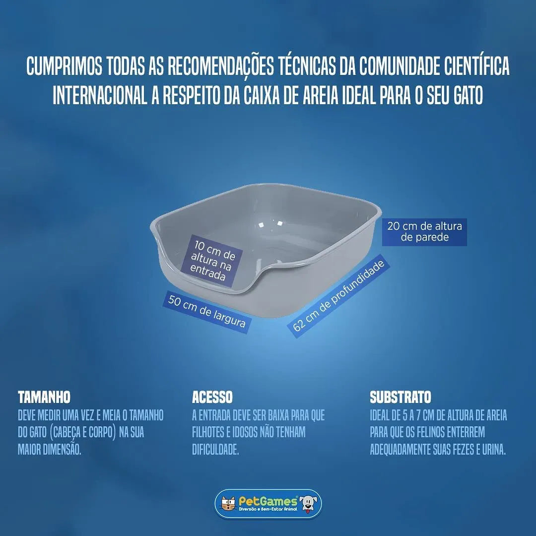 A caixa de areia ideal deve possuir 1,5x o comprimento do gato (cabeça e corpo) na sua maior dimensão.